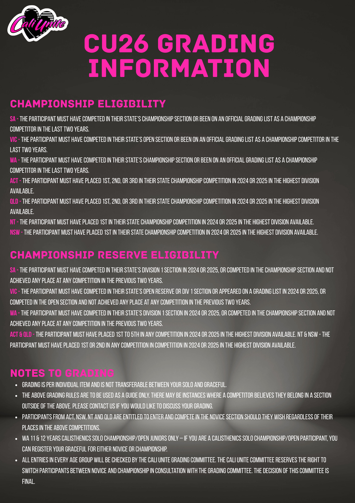 Have a question regarding grading? Submit the form below and one of the Cali Unite committee members will get back to you.